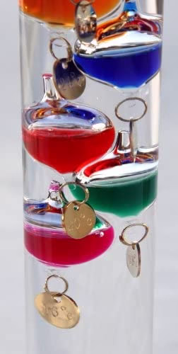 - This colourful GLASS GAILEO THERMOMETER is based on Galileo’s theory that was established 400 years ago, in liquid, a body of fixed mass becomes less buoyant as the liquid temperature rises, and becomes more buoyant as the temperature decreases, due to changes in liquid density.