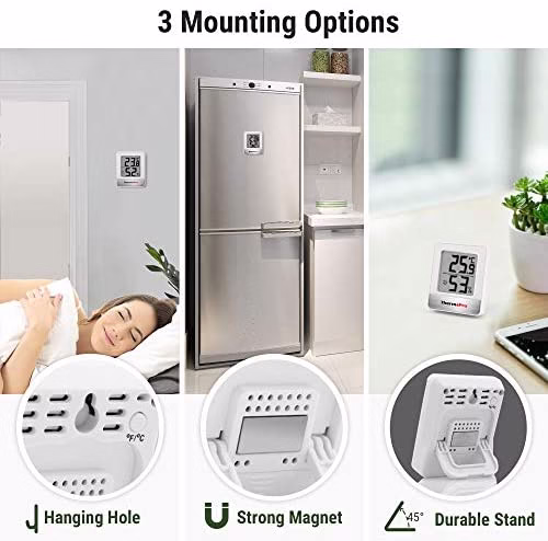 - Easy to read: The office thermometer’s big clear digits are easy to read from the LCD display; What’s more, it has a stand, has a magnet mount and a mounting slot on the back, allows you to put it practically anywhere; Temps can be displayed in either Fahrenheit or Celsius; What a helpful monitor for the purpose of controlling indoor temperature or humidity