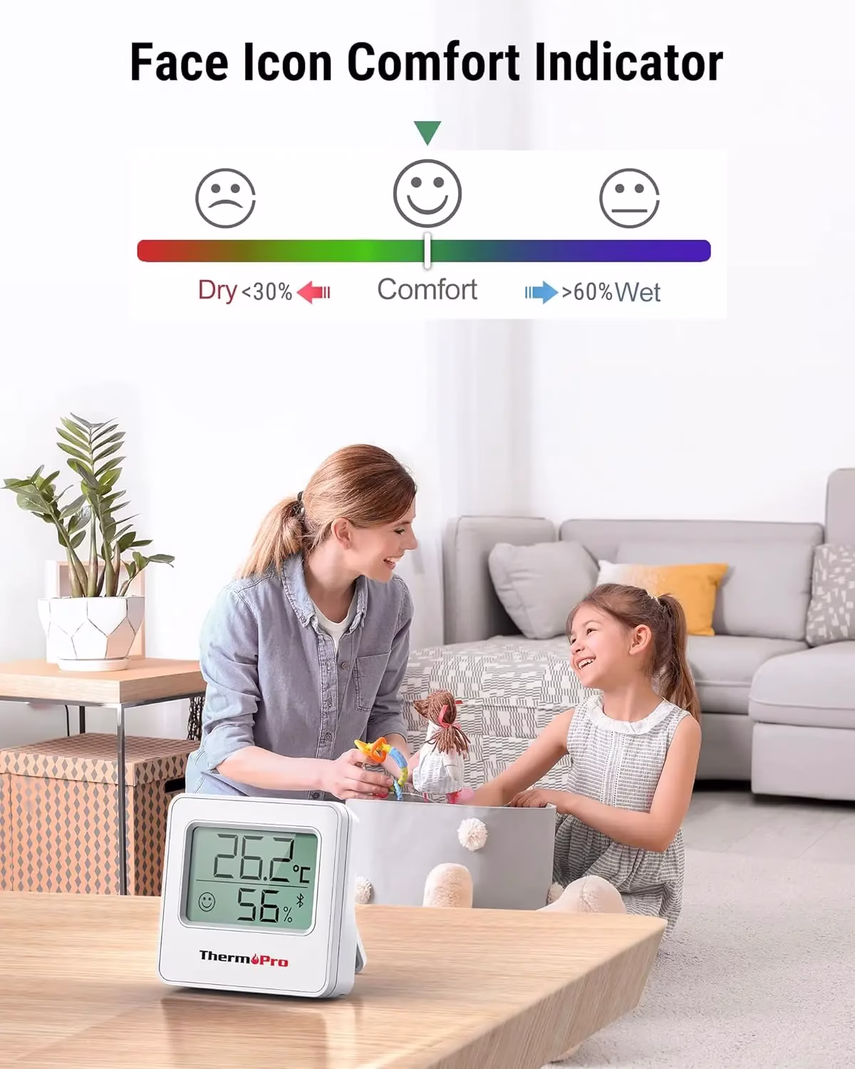 - Face Icon Comfort Indicators: Indoor thermometer for home features face icons comfort indicate DRY/COMFORT/WET air conditions in an easy to understand format and allow you to adjust your humidifier or dehumidifier accordingly