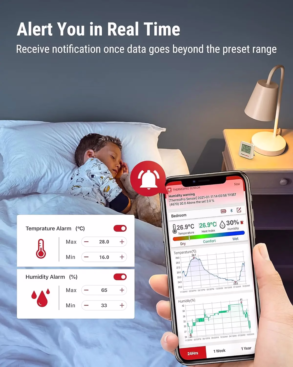 - Smart APP with Alerts: Set a temperature gauge range via the ThermoPro Sensor and instantly receive a phone notification if the temperature or humidity monitor levels fall outside of your range, allowing you to quickly react to make necessary adjustments